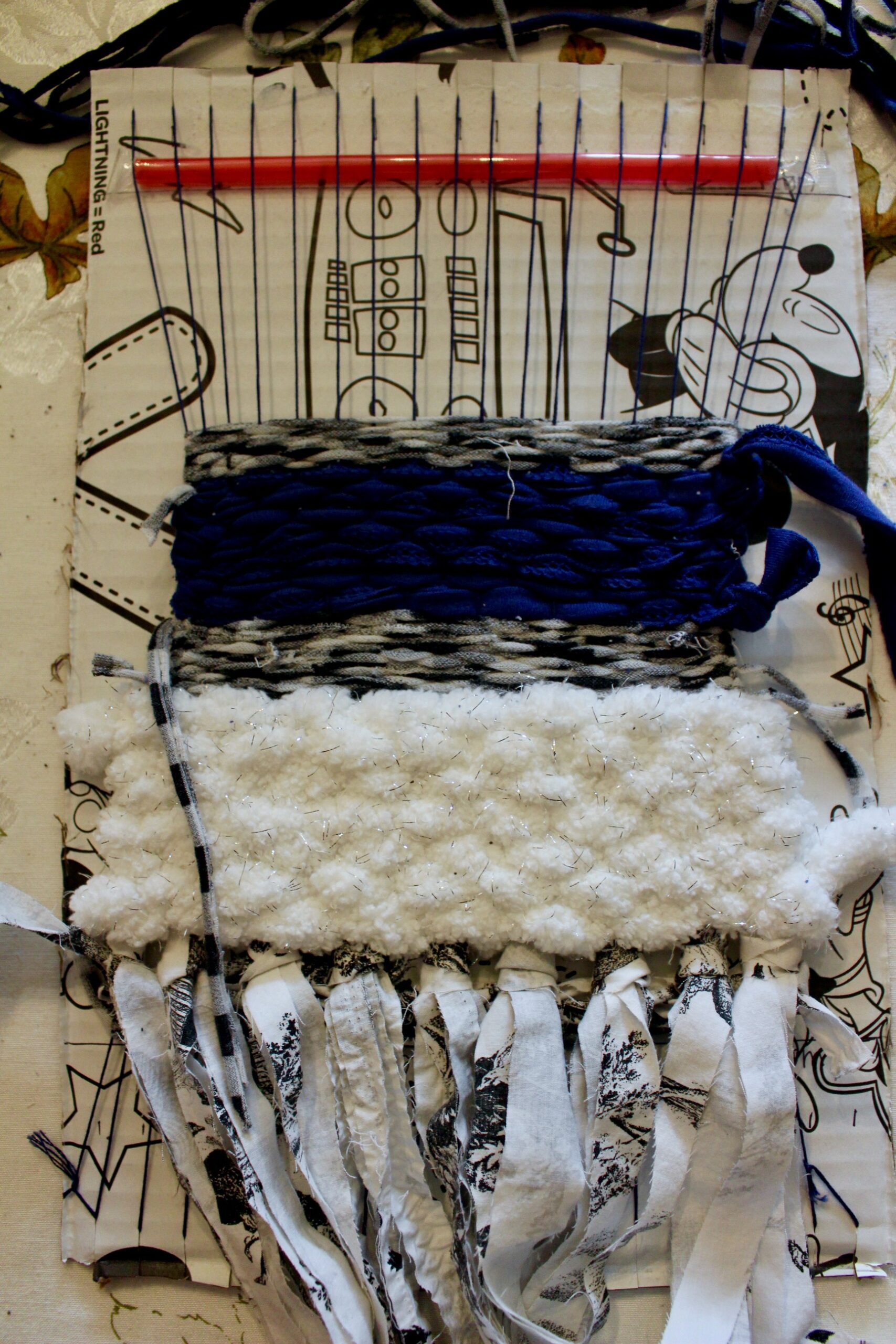 Now you can start weaving! I started with some strips of fabric, but went back and added some T-shirt yarn under to firm things up. I used a tabby stitch, which basically just ties one end of yarn to the far-right string of the loom and then weaves over, under, over, and on. When you get to the end of the weave/piece of yarn, you’ll just tie it off to the piece of string in the loom (either far left or far right).