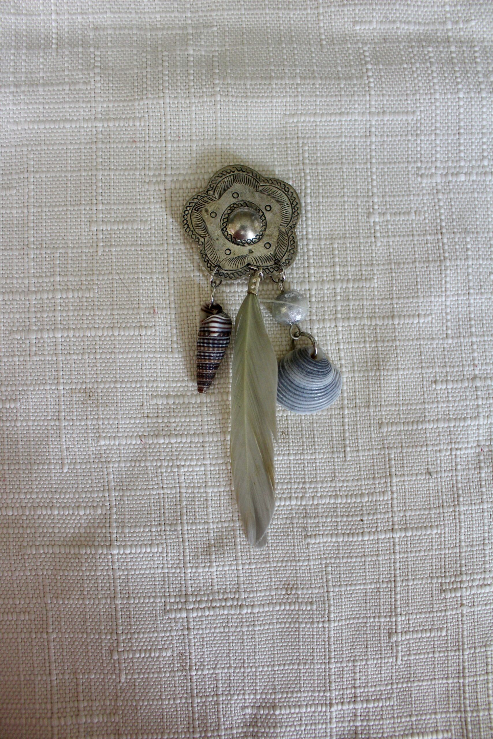 I used a lot of the techniques I shared in this post from early 2022 and made a few different things with my found objects – I started with this random, odd clip (the back clips on to things) and added a few found objects to it: two seashells and a feather. I attached some jump rings, and then attached those jump rings to the clip.