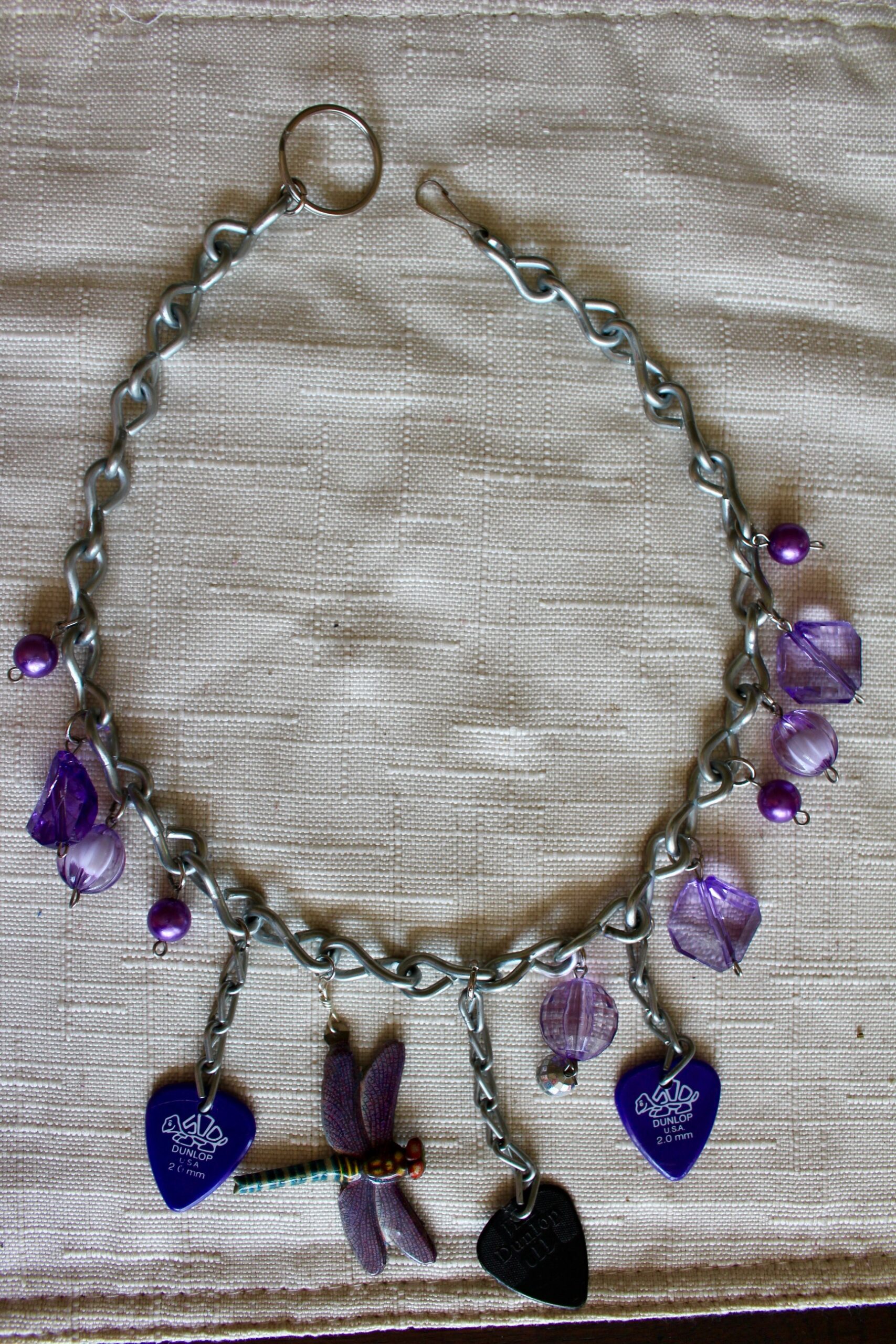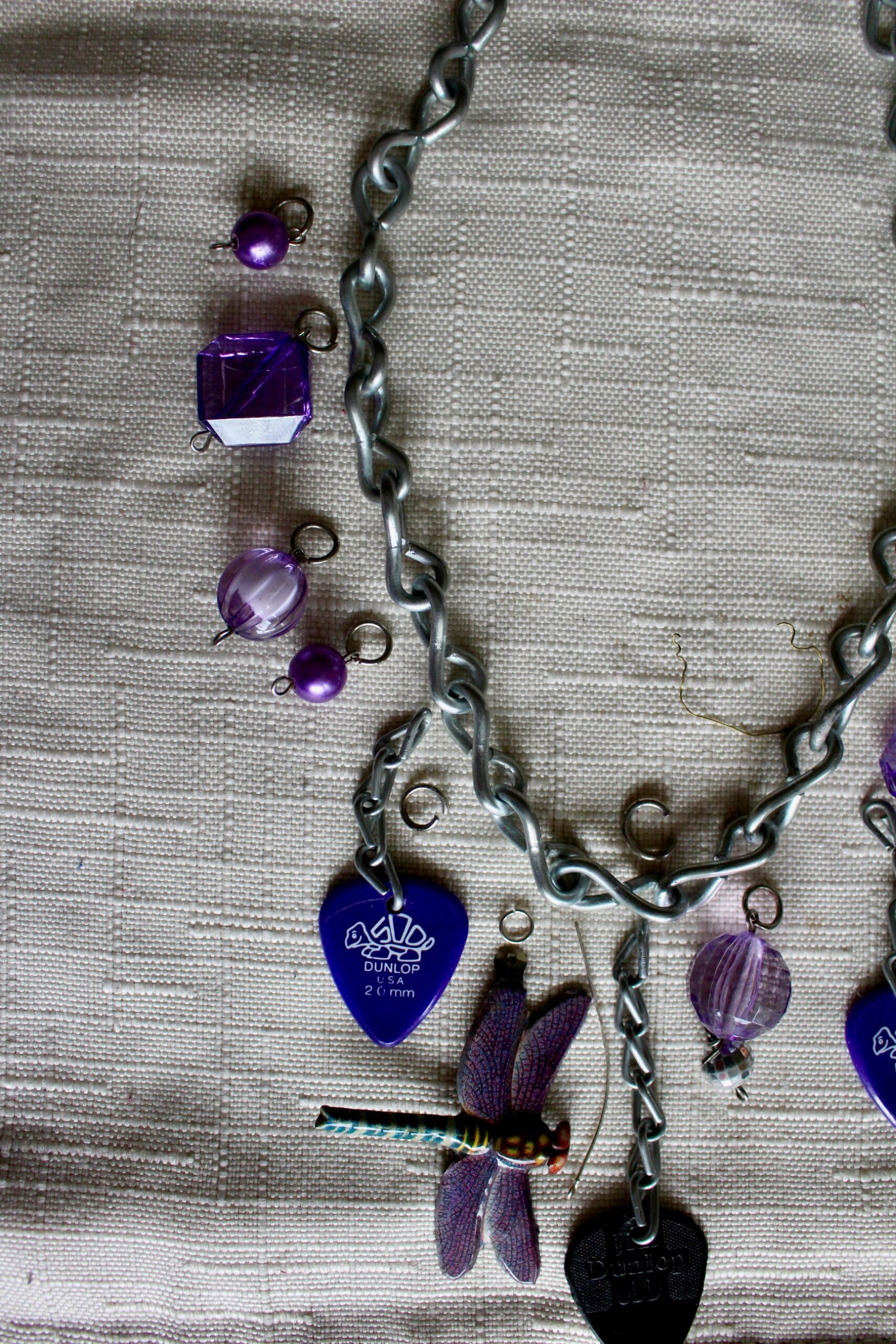If you are having a hard time landing on which items to use, one option is to stick to a color palette. Below I used a lot of purple found objects: old guitar picks, beads and a dragonfly pin that was broken, but became an excellent charm.