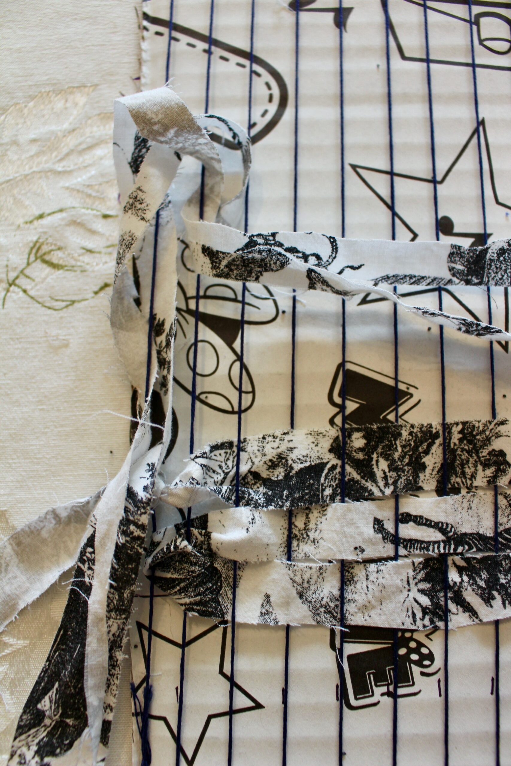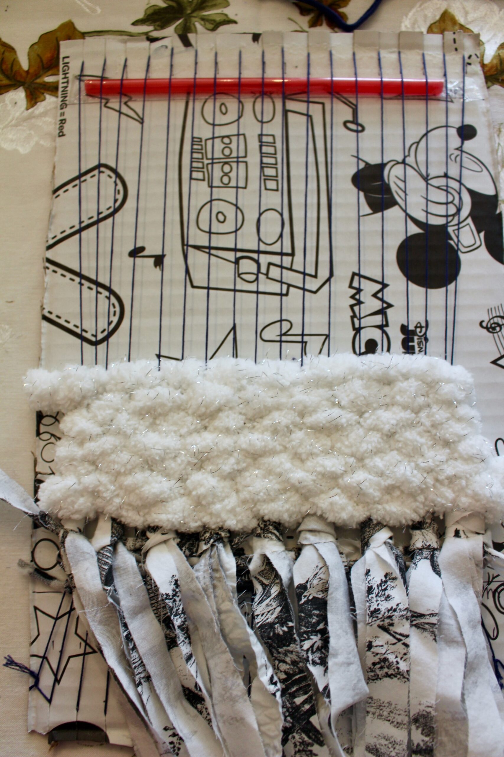 Now you can start weaving! I started with some strips of fabric, but went back and added some T-shirt yarn under to firm things up. I used a tabby stitch, which basically just ties one end of yarn to the far-right string of the loom and then weaves over, under, over, and on. When you get to the end of the weave/piece of yarn, you’ll just tie it off to the piece of string in the loom (either far left or far right).