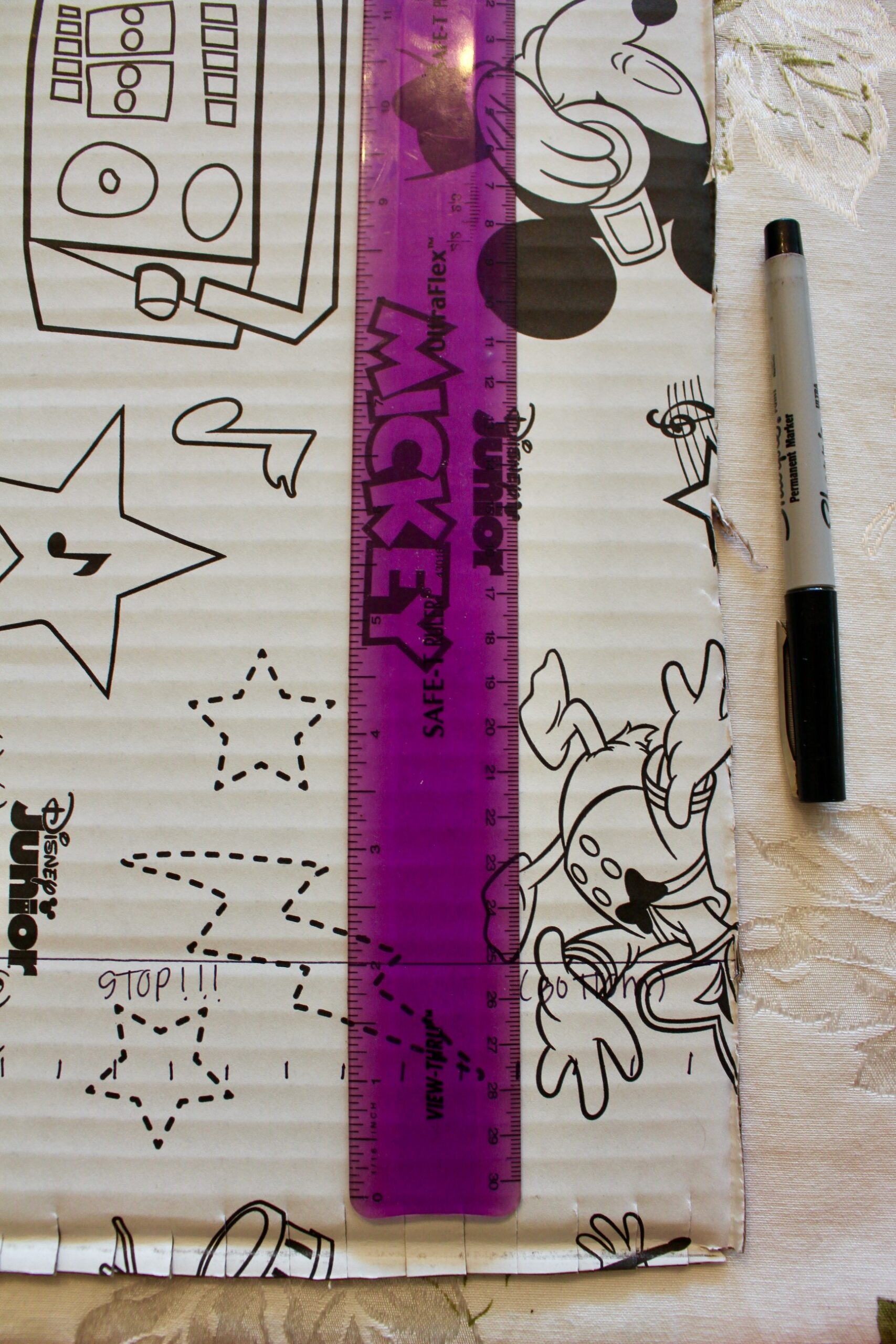 First things first, we’ll make our loom! You’ll measure 1/2 inch marks along the top and bottom of your piece of cardboard. Make sure you have an even number of marks. Then, you’ll make cuts on these marks. Probably about a 1/2 inch tall.