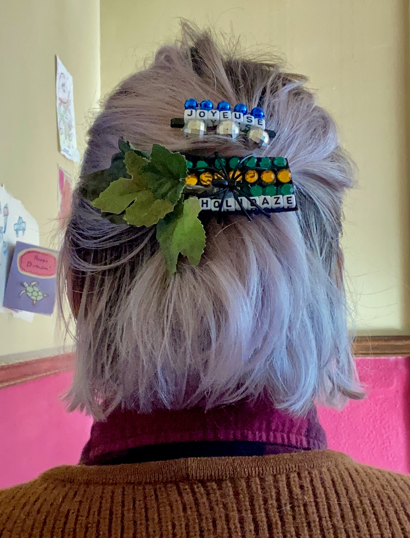 Next up, were bedazzled barrettes! I gathered some old, plain barrettes, letter beads, gems, fake leaves and a plastic spider and got to work! I started by spelling out a few silly, holiday themed phrases.