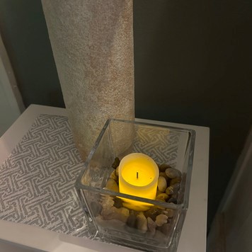 Next, my eyes caught sight of a clear cubed glass holder nestled among various items. Its simplicity and transparency intrigued me instantly and I had so many ideas of how to style it. After a couple of scrolls on Pinterest, I decided to pair it with decorative rocks, and an artificial candle. I’m not officially on the lookout for more cube glass holders because a set of these would be a stunning way to style any space!