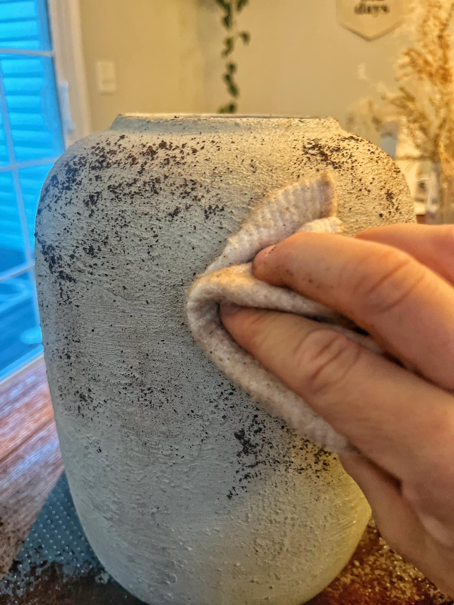 - After the second coat has dried completely and if you are using a lighter colored paint, you will take some old coffee grounds (I broke open my Nespresso pods and used those grounds, but you can use regular coffee grounds or grounds from a Keurig as well) and use your hand and fingers to press it into the paint. Rub the coffee grounds on the vase and press it in, then wipe it off with a dry microfiber cloth. This gives your vase a beautiful aged look and it’s incredible how much character it adds to your project!