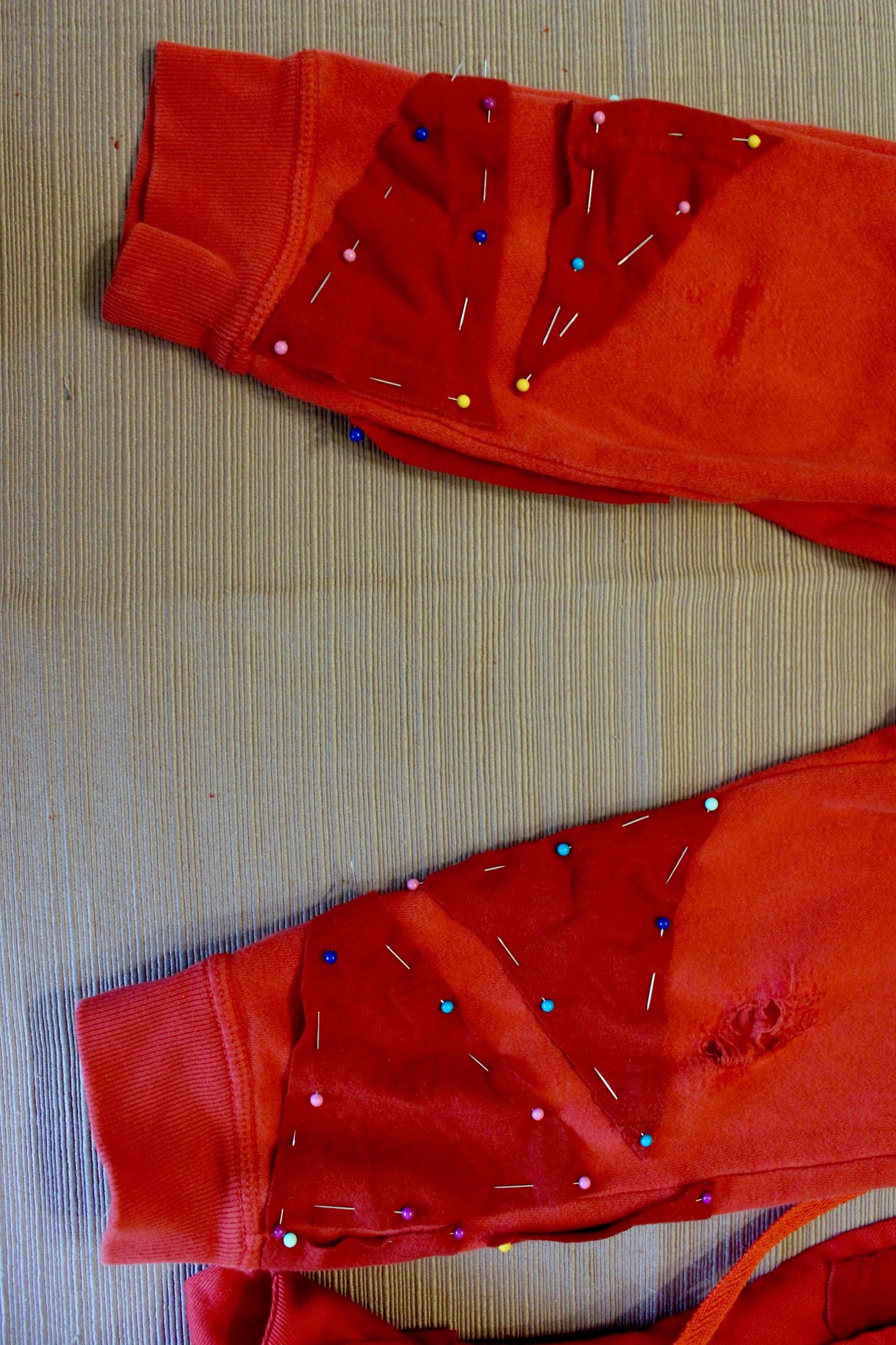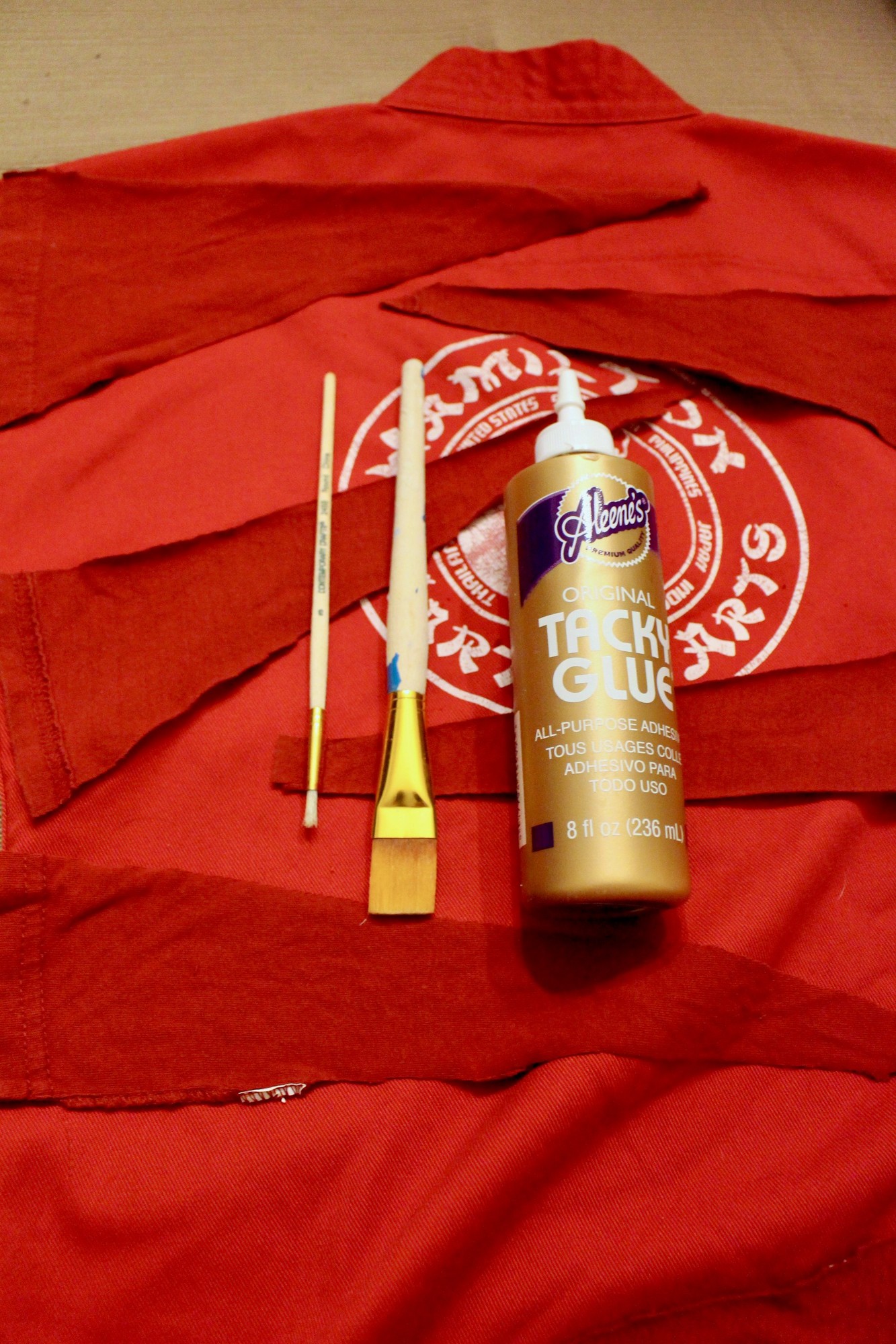 The steps are fairly simple: cut out triangles or stripes from your spare fabric and either glue or sew them to your base clothing pieces. I started by gluing some pieces down, but ended up sewing a running stitch along all stripes because I liked the look better.