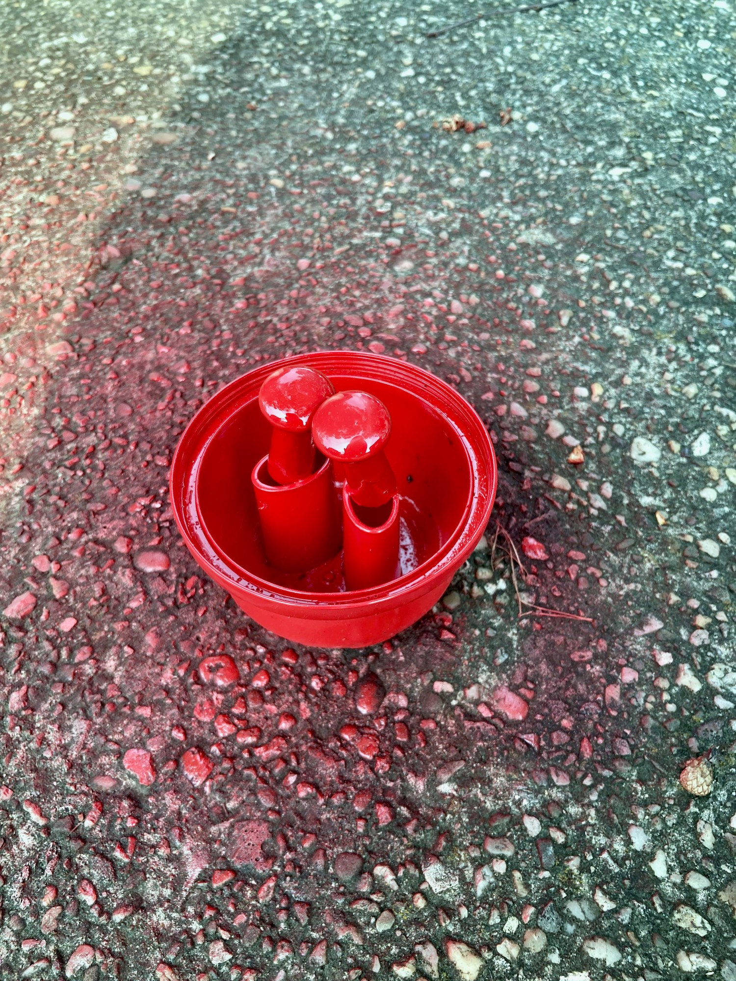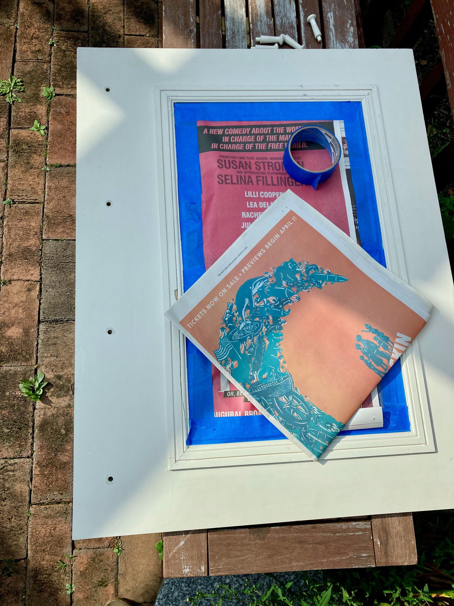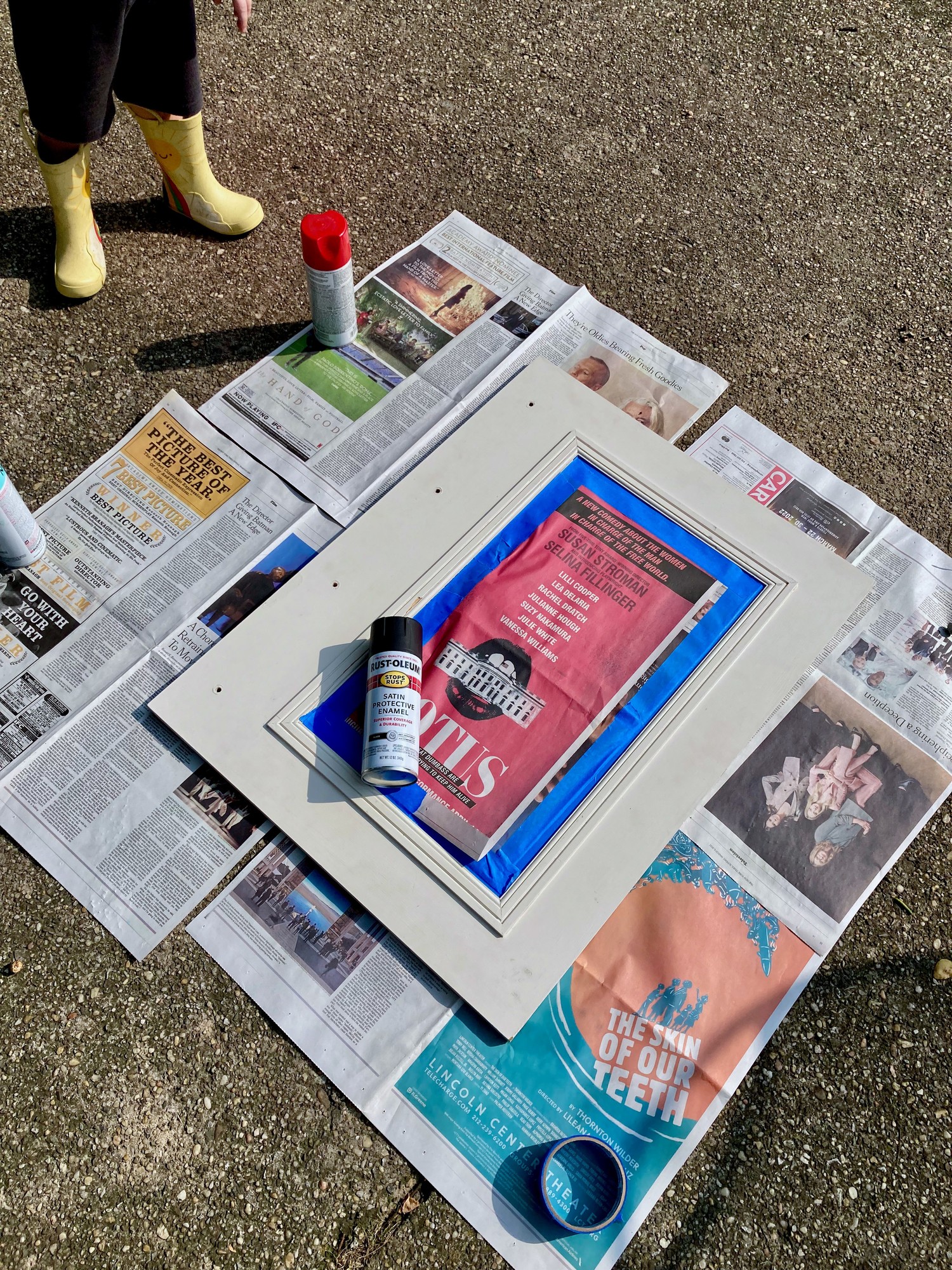 The first step is totally optional, but if you want, you can do a loose sanding of your mirror/wall hanging/whatever you are upcycling. Once you’ve sanded to your satisfaction, you’ll wipe all the loose bits off. Then you’ll tape off any areas you want to keep from getting painted (I covered the mirror and left the frame exposed). Next up is choosing your paint color – I polled my family to see what their thoughts were. We had a vote for blue, a vote for red, and a vote for black.