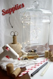 Step 8: Turn on your second light string and place the control switch with the first one. Reach down into the jar to wrap the rest of the string lights around your snowy hill. Shift the corks into place as necessary to get a look you like. When everything is set, decide where you’ll add your ornaments. When the placement looks good, dab in a little hot glue where you need to and stick everything in place!