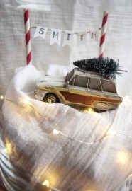 The great thing about this is that you can customize it for the person (or family) you’ll be giving it to. Add whatever you think they’d like best for decoration and top it off with a banner that spells out their family name. You can create it with a particular holiday in mind or swap out the Christmas tree for a snowman or sled, making it relevant for the whole season. Read on to find out how we made this one (spoiler alert: it started with a trip to your local Goodwill!)