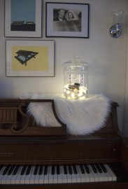 - White cloth for snow (We used a thrifted gauzy kitchen towel so you can see the glow of the lights through it, but you can also use a cable-knit scarf.)