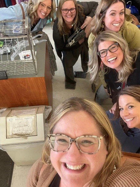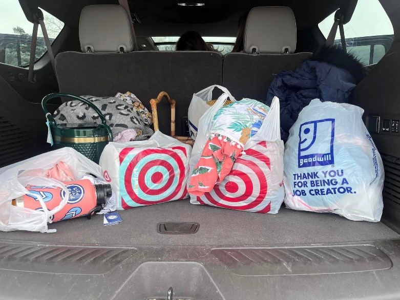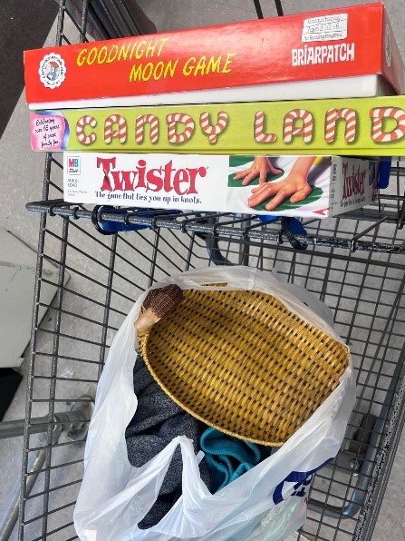 When we got to Twinsburg, we were excited about how big the store was. My friend Jenny, who had never been thrifting was a little overwhelmed at first, but as she scoured the kid’s racks, she was finding brands she loved and items she needed in her kid’s sizes and could not believe the price. We all split up at one point and went to different areas but then some grouped up and looked for kid’s sizes and styles for each other. I knew a friend was looking for a basket for her dresser to organize some things in her room and I found the perfect basket and quickly put it in my cart to show her and she said it was perfect. One friend was looking for some board games and found a few that looked brand new for $3 a piece! We all walked out with big bags of clothes, home items, and toys.