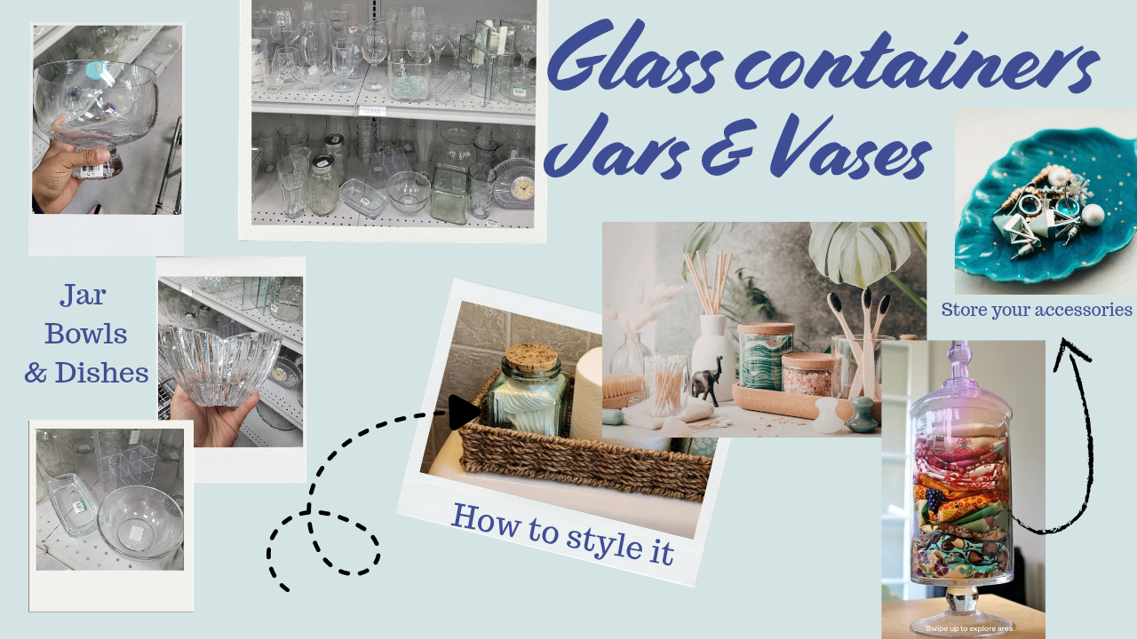 Glass containers, jars and vases. Glassware in general is another thrift store staple and an elegant and chic way to organize. Think of a crystal bowl to catch your rings and lip balm on your bedside table. A beautiful crystal wine glass or vase could be a fun way to hold your jewelry. Glass jars with lids are nice to contain anything from silk scarves on your dresser to coffee pods in your kitchen. I use a glass jar with a cork lid for my cotton pads in my bathroom. Glass containers are great to add a spa-like vibe to a bathroom. You can usually thrift them for less than $5.