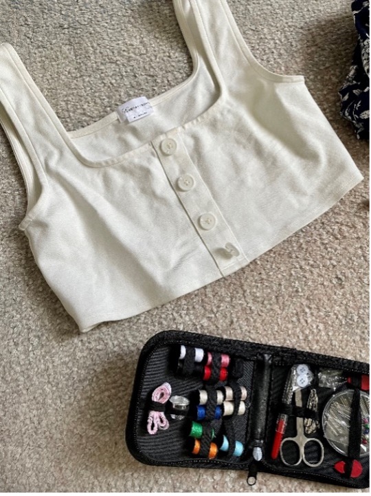 That’s why I’m willing to take some extra steps to shop smarter and more consciously. That might mean buying a pair of Joe’s Jeans from Goodwill with a small hole by the hem that I know I can patch up instead of buying the same pair at Bloomingdale’s for the full price. It also means taking home this adorable Lovers & Friends square neck top, which I know I’ll use for bachelorette activities, even though the bottom button was a little bit loose. With my handy little sewing kit, I was able to repair that and tighten up the other buttons in under ten minutes.