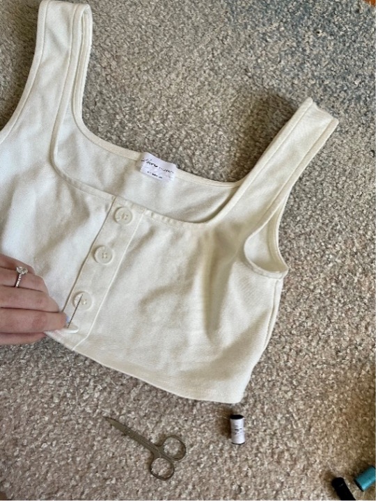 That’s why I’m willing to take some extra steps to shop smarter and more consciously. That might mean buying a pair of Joe’s Jeans from Goodwill with a small hole by the hem that I know I can patch up instead of buying the same pair at Bloomingdale’s for the full price. It also means taking home this adorable Lovers & Friends square neck top, which I know I’ll use for bachelorette activities, even though the bottom button was a little bit loose. With my handy little sewing kit, I was able to repair that and tighten up the other buttons in under ten minutes.